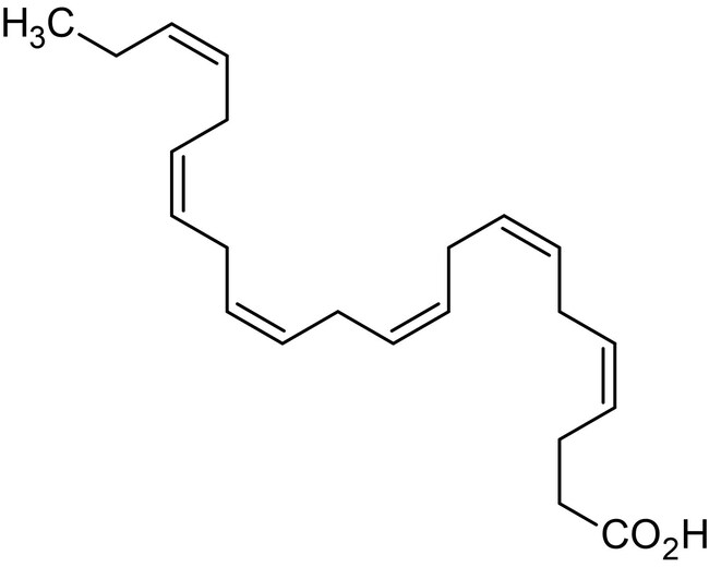 MW 328.5 g/mol, Purity >98%. Abundant essential n-3 polyunsaturated fatty acid in the CNS, shown to play a major anti-inflammatory role. Prevents LPS-induced dendritic cell maturation, characterized by a lack of proinflammatory cytokine production. Improves the nitroso-redox balance and reduces VEGF-mediated angiogenic signaling in microvascular endothelial cells. Inhibits Aβ1-42 fibrillation and toxicity in vitro. Retinoid X receptor (RXR) ligand.