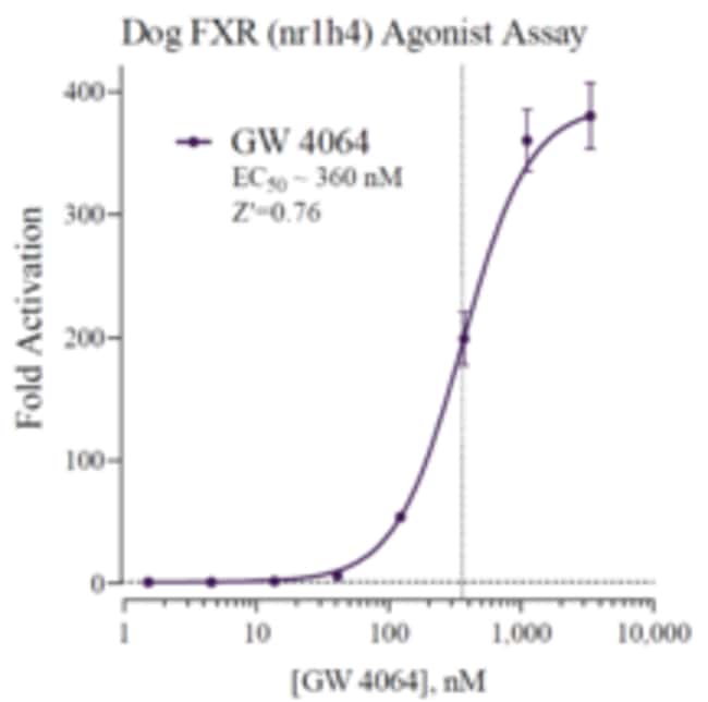 Dog FXR Reporter Cells are prepared using INDIGO’s proprietary CryoMite™ process. This cryo-preservation method yields high cell viability post-thaw, and provides the convenience of immediately dispensing healthy, division-competent reporter cells into assay plates. There is no need for intermediate spin-and-wash steps, viability determinations, or cell titer adjustments. [INDIGO Catalog Nos. D00601-32, D00601]