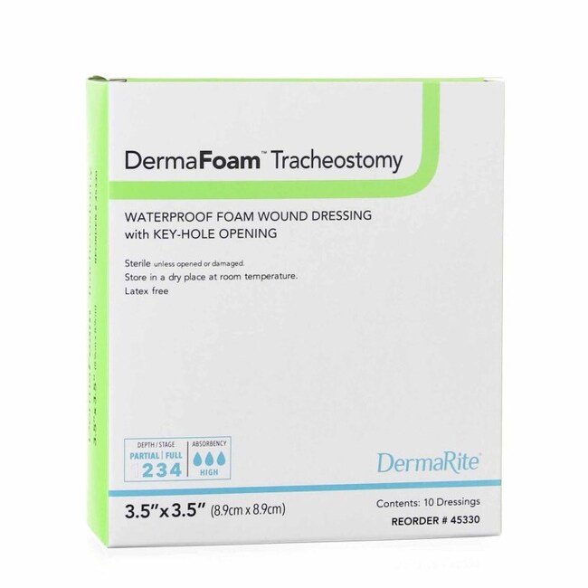 Med Vet International Foam Dressing DermaFoam Tracheostomy 3-1/2 X 3-1/2 Inch Without Border Waterproof Backing Nonadhesive Fenestrated Square Sterile, 45330, 10/Box
