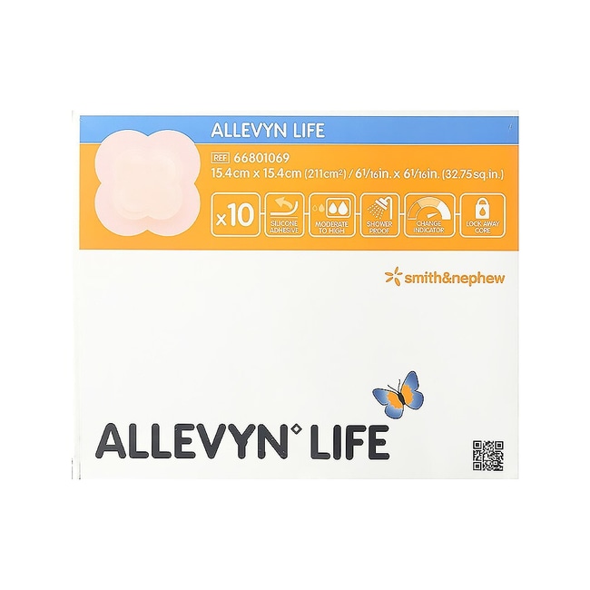 ALLEVYN LIFE is a silicone-gel adhesive, composite hydrocellular foam dressing Redistributes pressure more evenly than traditional foam dressing Up to 7 day wear time (except on the sacrum, which is up to a 5 day wear time) Indicated for shallow, granulating wounds, chronic and acute exudative wounds, full- and partial-thickness wounds such as pressure ulcers, leg ulcers, diabetic foot ulcers, infected wounds, malignant wounds, surgical wounds, first- and second-degree burns, donor sites, skin tears and fungating ulcers