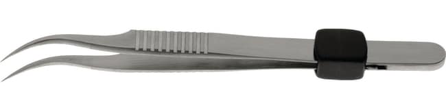 Curved, fine point tweezers have clamp ring. Length is 115 mm. Tip measures 0.17 x 0.10 mm. Made of Inox 08 a medical stainless steel composed of C, Mn, Cr, Mo and V that provides an excellent resistance to corrosion and a good resistance to salt. Although not as hard as Carbon steels, Inox 08 offers excellent resistance to corrosion. This magnetic alloy supports temperatures of around 400 degree C (DIN 50914) and is suitable for autoclave sterilization at 180 degree C. Medical stainless steel with excellent resistance to corrosion and good resistance to salt. Magnetic. Autoclave sterilize at 180 deg C.