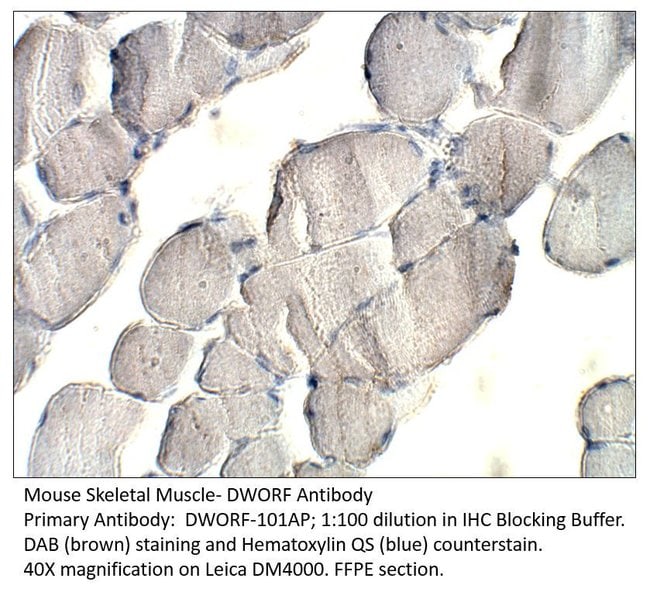 DWORF Polyclonal antibody specifically detects DWORF in Mouse samples. It is validated for ELISA, Immunohistochemistry, Immunoprecipitation, Western BlotSpecifications