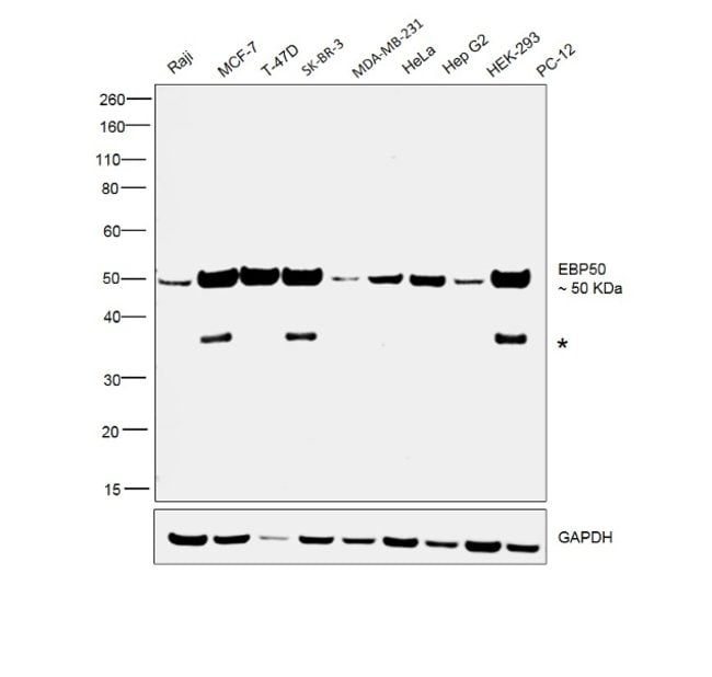 NHERF1 (Na+/H+ exchanger regulatory factor 1), also known as EBP50 (ezrin, radixin, moesin-binding phosphoprotein 50) is an adaptor protein, which associates with beta-catenin and is required for its localization at the cell-cell junctions, interacts with various G protein-coupled receptors and regulates their traffic, as well as sodium-hydrogen exchange and sodium-dependent phosphate transport. NHERF1/EBP50 inhibits cell motility and is required to suppress anchorage-independent growth. It contains C-terminal ERM (ezrin, radixin, moesin)-binding region and two N-terminal PDZ (postsynaptic-density-95/disc-large/ZO1 homology) domains and is able to form head-to-tail intramolecular conformation to regulate its interactions.