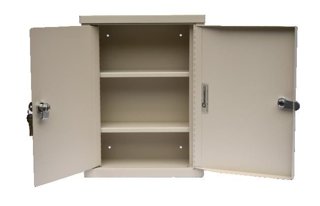 Cabinet is made of heavy gauge steel with a beige powder coated finish and are built to meet schedule 2 drug storage requirements. They have strong piano hinged doors and a two door, dual flat key locking system to ensure content security. The outside and inner door are secured with a heavy gauge locking cam. Three extra keys are included for each lock. The ambi top of the cabinet lifts so that the unit can be flipped to accommodate left or right outer door access. Its two aluminum shelves are adjustable and increase storage capacity. Pre-drilled holes ensure stable wall attachment. Warranted for 5 years with 1 year on the locks.