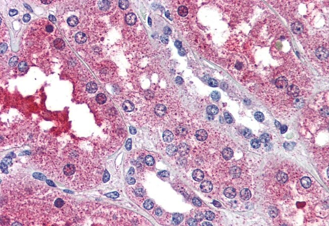 Percent identity with other species by BLAST analysis: Human, Gorilla (100%); Gibbon, Monkey, Marmoset (95%). For IHC(P), use proteinase K antigen retrieval. After incubation with the primary antibody, slides were incubated with biotinylated secondary antibody, followed by alkaline phosphatase-streptavidin and chromogen.