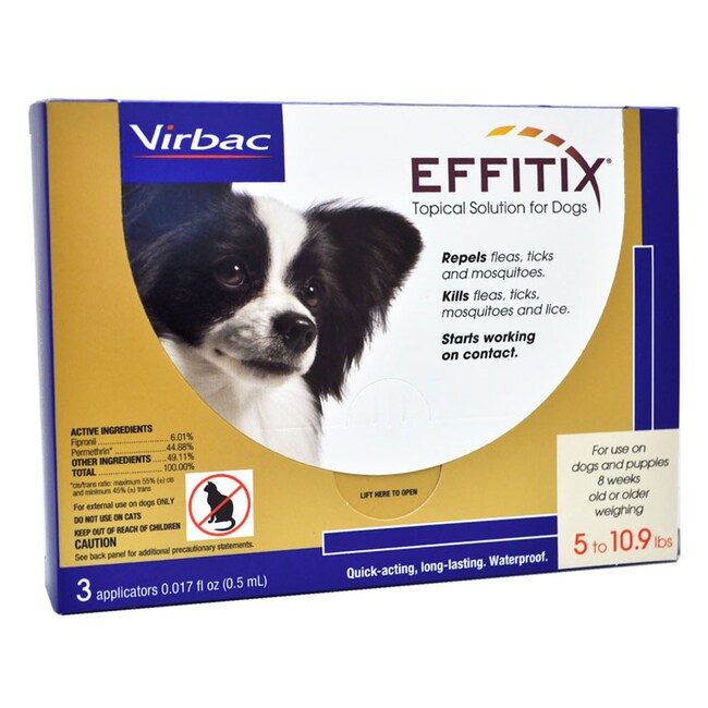 Effitix Topical Solution for Dogs contains Fipronil and Permethrin, which control infestatons caused by fleas, ticks and lice; repels biting flies and repels and kills mosquitoes.Products are not always manufacturer specific. Actual product appearance may differ from website image.