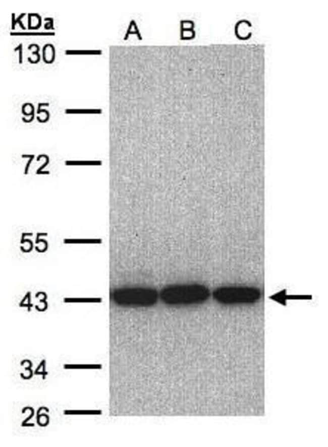 Recommended positive controls: 293T, A431, H1299, HeLaS3, HepG2, Molt-4, Raji. Predicted reactivity: Mouse (96%), Rat (97%), Chicken (91%), Bovine (97%). Store product as a concentrated solution. Centrifuge briefly prior to opening the vial.