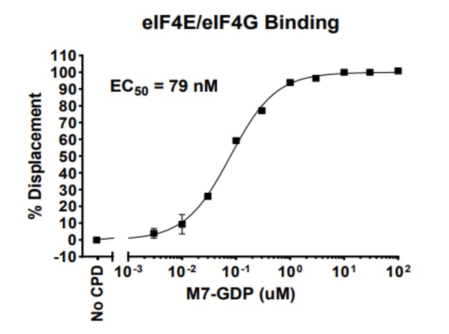 A fluorescence-labelled tracer and the N-terminal tagged full-length human eIF4E/eIF4G complex are used in this assay kit. A Terbium-labeled antibody binding to the tag on eIF4E serves as a fluorescence donor (HTRF donor). The binding of the fluorescence-labeled tracer to the eIF4E brings Terbium on the anti-Tag antibody close to the fluorophore on the tracer (HTRF acceptor). Activation of the Terbium results in fluorescence resonance energy transfer (FRET). Thus, the binding status can be quantitively measured by calculating the ratio of the emission fluorescence intensity of the acceptor (665 nm) and donor (620 nm). The competitive binding of a non-fluorescence compound will reduce the FRET signal.