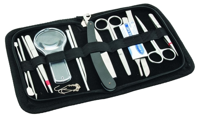 | Includes | Two scissors, two forceps, four needles, one scalpel, one BP handle with blade, one razor, one magnifying glass, 1 chain and hook, one blow pipe |