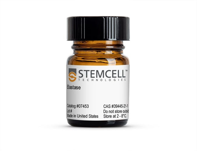 Elastase is a serine protease consisting of a single polypeptide chain of 240 amino acid residues and contains four disulfide bridges (Shotton Hartley). Elastase is synthesized as a zymogen (proelastase) and is converted to the active form by limited trypsin proteolysis at its N-terminal. Elastase preferentially cleaves the peptide bond of C-terminal neutral non-aromatic amino acid residues (Schellenberger et al.). Elastase is frequently used in combination with other proteases such as collagenase and trypsin to digest fibrous tissues because of its ability to digest native elastin.