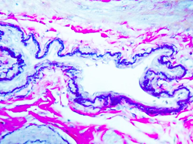 The Elastic Stain Kit (Modified Verhoff’s) is intended for use in histological demonstration of elastin in tissue sections. Demonstration of elastic tissue is useful in cases of emphysema (atrophy of elastic tissue), arteriosclerosis (thinning and loss of elastic fibers) and various other vascular diseases.