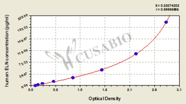 This Human ELN ELISA Kit was designed for the quantitative measurement of Human ELN protein in serum, plasma, cell culture supernates, tissue homogenates, cell lysates, urine. It is a Sandwich ELISA kit, its detection range is 3.12 pg/mL-200 pg/mL and the sensitivity is 0.78 pg/mL . One kit contains 96 wells.