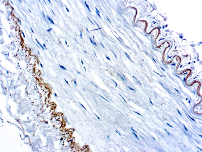 This antibody recognizes insoluble elastin, α-elastin, soluble non-cross linked precursor of elastin (tropoelastin). Elastin is an important polymeric protein of connective tissue that imparts elasticity to vertebrate elastic tissues.