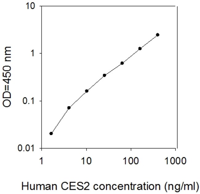 For Serum, Plasma, and Cell Culture Supernatants. Sensitivity: 1.6 ng/ml. Pre-coated 96-well strip plate with additional reagents to allow for use in multiple experiments. Specificity: This ELISA antibody pair recognizes Human Carboxylesterase 2.
