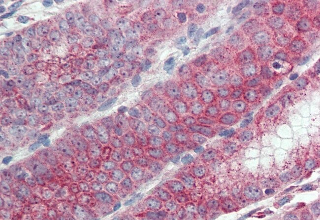 Percent identity with other species by BLAST analysis: Human, Chimpanzee, Gorilla, Monkey (100%); Orangutan (94%); Gibbon, Marmoset, Bat (88%); Bovine, Dog (82%). For IHC(P), use heat induced antigen retrieval in pH 6.0 citrate buffer. After incubation with the primary antibody, slides were incubated with biotinylated secondary antibody, followed by alkaline phosphatase-streptavidin and chromogen.