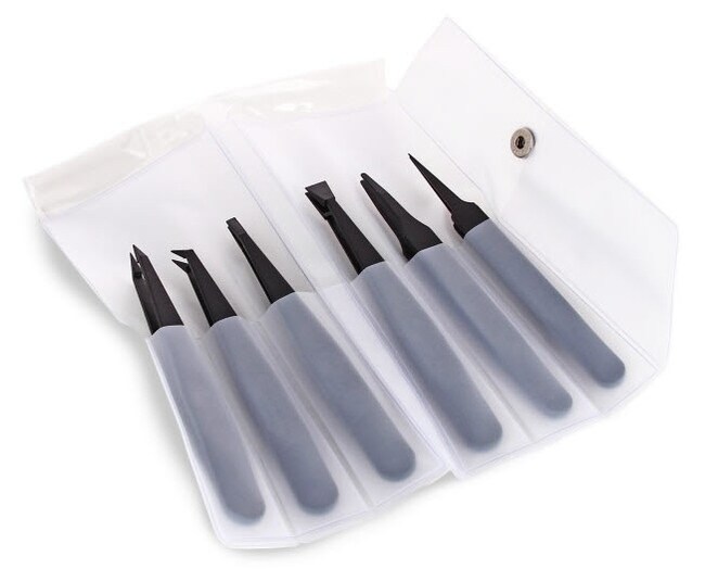 Continuous use temp to 150 degree C. High purity, chemical resistant, ESD safe. Clean room and medical devices approved with low extraction value. Made from SV plastic based on polyvinylidene fluoride (PVDF) for good mechanical strength and toughness, smooth surface. Excellent chemical resistance to most aggressive substances. Set of five tweezers styles 702A, 705, 707, 708, 709, 710.