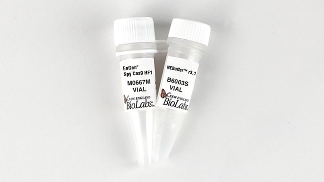 EnGen Spy Cas9 HF1 is a high-fidelity, quadruple substitution (N497A/R661A/Q695A/Q926A) variant of EnGen Spy Cas9 NLS from Streptococcus pyogenes with reduced non-specific DNA cleavage. Spy Cas9 is an RNA-guided endonuclease that catalyzes site-specific cleavage of double stranded DNA. The single guide RNA (sgRNA) targets Cas9 to the region immediately upstream of a 5'-NGG-3' protospacer adjacent motif (PAM) producing a double stranded break 3 bases upstream of the PAM. EnGen Spy Cas9 HF1 contains Simian virus 40 (SV40) T antigen nuclear localization sequence (NLS) on the N- and C-termini of the protein.
