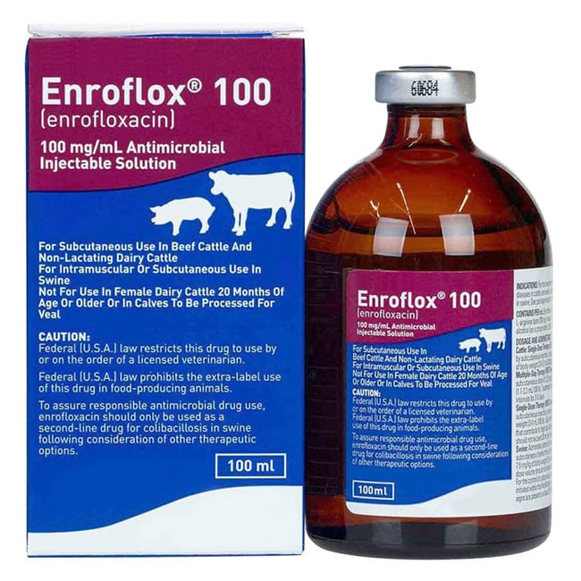 Cattle - Single-Dose Therapy: Enroflox 100 is indicated for the treatment of bovine respiratory disease (BRD) associated with Mannheimia haemolytica, Pasteurella multocida, Histophilus somni and Mycoplasma bovis in beef and non-lactating dairy cattle; and for the control of BRD in beef and non-lactating dairy cattle at high risk of developing BRD associated with M. haemolytica, P. multocida, H. somni and M. bovis. Cattle - Multiple-Day Therapy: Enroflox 100 is indicated for the treatment of bovine respiratory disease (BRD) associated with Mannheimia haemolytica, Pasteurella multocida and Histophilus somni in beef and non-lactating dairy cattle. Swine: Enroflox 100 is indicated for the treatment and control of swine respiratory disease (SRD) associated with Actinobacillus pleuropneumoniae, Pasteurella multocida, Haemophilus parasuis and Streptococcus suis.