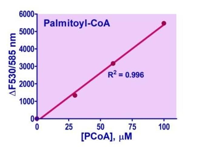 Fatty Acyl-CoAs are a combination of Coenzyme A covalently bound to long-chain fatty acids. Fatty acyl-CoAs serve as both a precursor for triglyceride and phospholipids synthesis and a product of lipid catabolism. Catabolically, they facilitate the transport of fatty acids to the mitochondria for shuttling via the carnitine shuttle and subsequent β-oxidation of the fatty acid. Conversion of fatty acids to fatty acyl-CoAs is necessary for the generation of ATP during periods of high energy demand. Elevated fatty acyl-CoA levels may indicate dysregulation of lipid metabolism such as due to insulin resistance. Certain genetic disorders may also affect fatty acyl-CoA levels. BioAssay Systems’ fluorimetric fatty acyl-CoA assay works using a combination of enzymes that utilize fatty acyl-CoA as a substrate, which is coupled to form a fluorescent product. The resulting fluorescence intensity at λexc/em = 530/585 nm is linear to the fatty acyl-CoA concentration in the sample.
