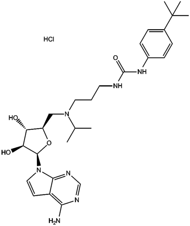 EPZ004777 HCl (CAS 1380316-03-9) is a selective inhibitor of DOT1L a histone methyltransferase responsible for catalyzing methylation at lysine 79 of histone H3 (H3K79) It inhibits DOT1L enzymatic activity with an IC50 of approximately 400 pM In vitro studies demonstrate concentration-dependent suppression of H3K79 methylation and proliferation inhibition in various leukemia cell lines notably those harboring mixed lineage leukemia (MLL) rearrangements such as MV4-11 (MLL-AF4) and MOLM-13 (MLL-AF9) EPZ004777 serves as a valuable research tool for investigating epigenetic regulation in leukemia and exploring potential therapeutic targets