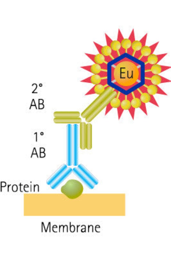 The ScanLater Eu-Labeled Goat Anti-Mouse Western Blot Assay Kit is a europium-based detection kit designed for sensitive, time-resolved fluorescence western blot analysis. It supplies Eu-labeled secondary antibody and the blocking and wash buffers needed for nitrocellulose or PVDF membrane detection.
