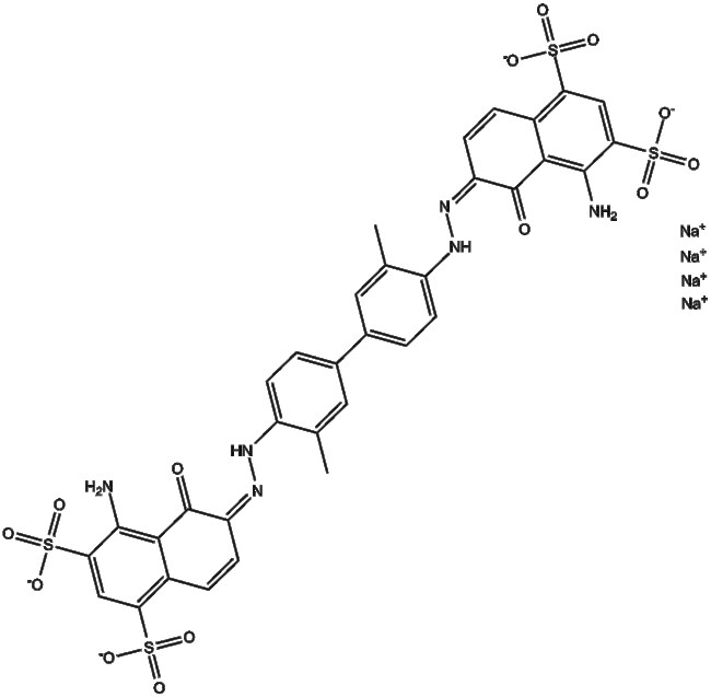 Evans Blue tetrasodium salt (CAS 314-13-6) is a small molecule inhibitor of non-NMDA glutamate receptors specifically targeting AMPA and kainate receptor-mediated currents It exhibits potent inhibition of GluR1 and GluR6 subunits with IC50 values of 220 nM and 150 nM respectively and suppresses GluR1 2-mediated responses at 355 nM in vitro Evans Blue does not act as a competitive antagonist at the agonist binding site but modulates receptor desensitization reducing current amplitude and modifying desensitization and recovery kinetics No in vivo or clinical studies have been reported This compound is utilized in the study of glutamatergic neurotransmission and receptor pharmacology