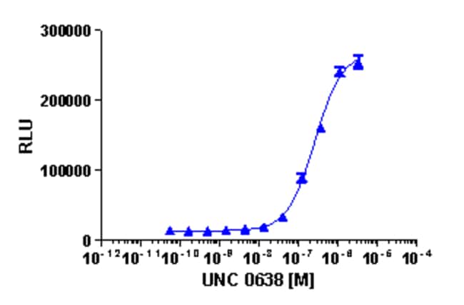 The InCELL Hunter eXpress A549 G9a Methyltransferase Assay provides an easy-to-use cell based assay to study small molecule drug candidates that engage with regulators of epigenetics pathways. This kit assesses compound-engagement-based stabilization of G9a via detection of G9a levels. This product uses EFC technology. The cell line included overexpresses G9a target protein fused to ProLabel. In the absence of compound that binds and stabilizes the target, this protein is degraded and no EFC signal is produced. When compound engages and stabilizes the target, EA contained in the detection reagent produces EFC signal. eXpress kits are a convenient, ready-to-use format which contains all materials needed to run the assay, including single-use vials of cryopreserved cells, cell plating media, detection reagent, and assay plates. For detailed product information, User Manual and Datasheet, visit www.discoverx.com/express.