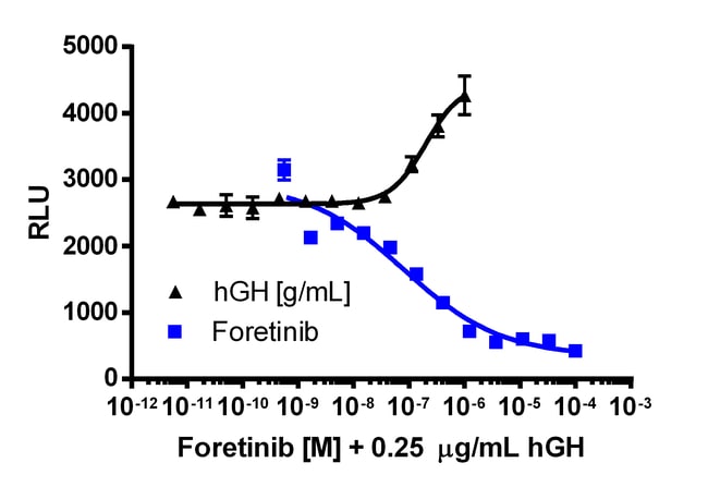 The PathHunter eXpress BLK Activity Assay is a stable, engineered cell line for use in studying small molecule drug candidates targeting the BLK kinase domain. The cell line is engineered to express the catalytic domain from BLK fused to the cytokine receptor binding domain (CRBD) of JAK2. The cells co-express an Enzyme Acceptor (EA) tagged SH2 domain and a ProLink (PK) tagged Cytokine receptor. The CRBD is designed to bind the CTK catalytic domain to the GHR-PK. Activation of the GHR-PK induces receptor phosphorylation by the BLK catalytic domain. This leads to SH2-EA recruitment and production of EFC signal. eXpress kits are a convenient, ready-to-use format which contains all materials needed to run the assay, including single-use vials of cryopreserved cells, cell plating media, detection reagent, and assay plates. For detailed product information, User Manual and Datasheet, visit www.discoverx.com/express.