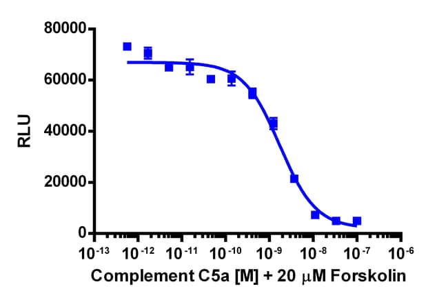 The cAMP Hunter C5AR1 eXpress kit provides an easy-to-use cell based assay to study drug candidates (small molecules or biologics) targeting GPCRs. This kit assesses ligand (e.g. C5a) based activation of C5AR1 GPCR activity via detection of decreasing levels of intracellular cAMP. This product uses EFC technology. The cells overexpress wild type C5AR1, a naturally Gi/Go coupled GPCR. Upon activation of C5AR1, the decrease in levels of intracellular cAMP leads to a decreased signal from EFC when the cAMP detection kit is applied. eXpress kits are a convenient, ready-to-use format which contains all materials needed to run the assay, including single-use vials of cryopreserved cells, cell plating media, detection reagent, and assay plates. For detailed product information, User Manual and Datasheet, visit www.discoverx.com/express.
