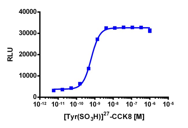 The PathHunter CCKBR eXpress kit provides an easy-to-use cell based assay to study drug candidates (small molecules or biologics) targeting GPCRs. This kit assesses ligand (e.g. cholecystokinin) based activation of CCKBR GPCR activity via detection of β-arrestin recruitment. The included cell line overexpresses ProLink-tagged CCKBR and EA-tagged β-Arrestin-2. Activation of CCKBR stimulates the recruitment of β-Arrestin-2 and produces EFC signal. eXpress kits are a convenient, ready-to-use format which contains all materials needed to run the assay, including single-use vials of cryopreserved cells, cell plating media, detection reagent, and assay plates. For detailed product information, User Manual and Datasheet, visit www.discoverx.com/express.