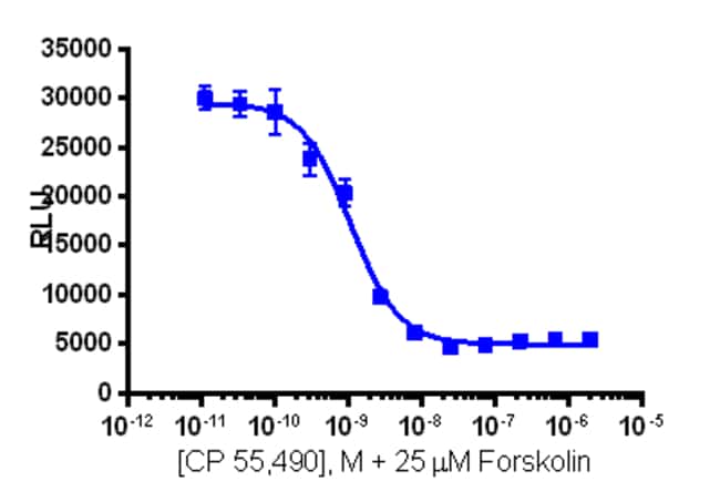 The cAMP Hunter CNR2 eXpress kit provides an easy-to-use cell based assay to study drug candidates (small molecules or biologics) targeting GPCRs. This kit assesses ligand (e.g. CP 55,940) based activation of CNR2 GPCR activity via detection of decreasing levels of intracellular cAMP. This product uses EFC technology. The cells overexpress wild type CNR2, a naturally Gi/Go coupled GPCR. Upon activation of CNR2, the decrease in levels of intracellular cAMP leads to a decreased signal from EFC when the cAMP detection kit is applied. eXpress kits are a convenient, ready-to-use format which contains all materials needed to run the assay, including single-use vials of cryopreserved cells, cell plating media, detection reagent, and assay plates. For detailed product information, User Manual and Datasheet, visit www.discoverx.com/express.