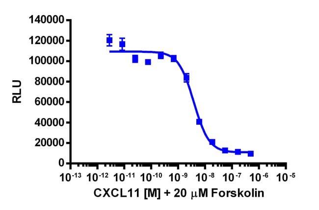 The cAMP Hunter CXCR3 eXpress kit provides an easy-to-use cell based assay to study drug candidates (small molecules or biologics) targeting GPCRs. This kit assesses ligand (e.g. CXCL11/I-TAC) based activation of CXCR3 GPCR activity via detection of decreasing levels of intracellular cAMP. This product uses EFC technology. The cells overexpress wild type CXCR3, a naturally Gi/Go coupled GPCR. Upon activation of CXCR3, the decrease in levels of intracellular cAMP leads to a decreased signal from EFC when the cAMP detection kit is applied. eXpress kits are a convenient, ready-to-use format which contains all materials needed to run the assay, including single-use vials of cryopreserved cells, cell plating media, detection reagent, and assay plates. For detailed product information, User Manual and Datasheet, visit www.discoverx.com/express.