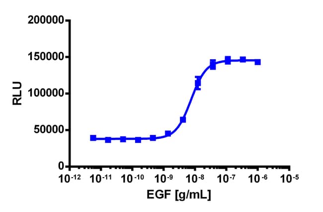 The PathHunter EGFR/EGFR Dimerization eXpress kit provides an easy-to-use cell based assay to study drug candidates (small molecules or biologics) targeting receptor-receptor interaction. This kit assesses ligand (e.g. EGF) induced dimerization of EGFR/EGFR receptors. This product uses EFC technology. The cell line included overexpresses EGFR target protein fused to PK alongside EGFR target protein fused to EA. Upon ligand-induced dimerization of EGFR/EGFR, detectable EFC signal is produced. eXpress kits are a convenient, ready-to-use format which contains all materials needed to run the assay, including single-use vials of cryopreserved cells, cell plating media, detection reagent, and assay plates. For detailed product information, User Manual and Datasheet, visit www.discoverx.com/express.