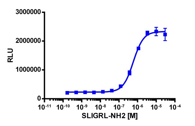 The PathHunter F2RL1 (PAR2; GPR11) eXpress kit provides an easy-to-use cell based assay to study drug candidates (small molecules or biologics) targeting GPCRs. This kit assesses ligand (e.g. proteases, SLIGRL) based activation of F2RL1 GPCR activity via detection of β-arrestin recruitment. The included cell line overexpresses ProLink-tagged F2RL1 and EA-tagged β-Arrestin-2. Activation of F2RL1 stimulates the recruitment of β-Arrestin-2 and produces EFC signal. eXpress kits are a convenient, ready-to-use format which contains all materials needed to run the assay, including single-use vials of cryopreserved cells, cell plating media, detection reagent, and assay plates. For detailed product information, User Manual and Datasheet, visit www.discoverx.com/express.