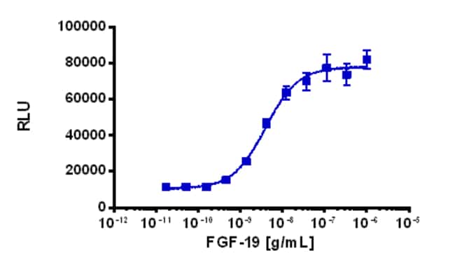 The PathHunter eXpress FGFR4-β-Klotho Functional Assay provides an easy-to-use cell based assay to study drug candidates (small molecules or biologics) targeting RTKs. This kit assesses RTK activation via detection of activated FGFR4 and β-Klotho dimerization-induced SH2 domain protein recruitment. This product uses EFC technology. The included cell line overexpresses ProLink-tagged FGFR4 and an EA-tagged SH2 domain protein. It also overexpresses an untagged coreceptor, β-Klotho. Upon ligand-induced receptor activation, SH2-EA recruitment leads to production of EFC signal. eXpress kits are a convenient, ready-to-use format which contains all materials needed to run the assay, including single-use vials of cryopreserved cells, cell plating media, detection reagent, and assay plates. For detailed product information, User Manual and Datasheet, visit www.discoverx.com/express.