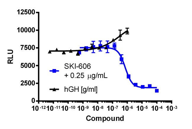 The PathHunter eXpress FGR Activity Assay is a stable, engineered cell line for use in studying small molecule drug candidates targeting the FGR kinase domain. The cell line is engineered to express the catalytic domain from FGR fused to the cytokine receptor binding domain (CRBD) of JAK2. The cells co-express an Enzyme Acceptor (EA) tagged SH2 domain and a ProLink (PK) tagged Cytokine receptor. The CRBD is designed to bind the CTK catalytic domain to the GHR-PK. Activation of the GHR-PK induces receptor phosphorylation by the FGR catalytic domain. This leads to SH2-EA recruitment and production of EFC signal. eXpress kits are a convenient, ready-to-use format which contains all materials needed to run the assay, including single-use vials of cryopreserved cells, cell plating media, detection reagent, and assay plates. For detailed product information, User Manual and Datasheet, visit www.discoverx.com/express.