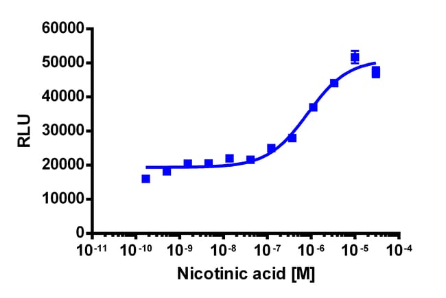 The PathHunter GPR109A eXpress kit provides an easy-to-use cell based assay to study drug candidates (small molecules or biologics) targeting GPCRs. This kit assesses ligand (e.g. nicotinic acid) based activation of GPR109A GPCR activity via detection of β-arrestin recruitment. The included cell line overexpresses ProLink-tagged GPR109A and EA-tagged β-Arrestin-2. Activation of GPR109A stimulates the recruitment of β-Arrestin-2 and produces EFC signal. eXpress kits are a convenient, ready-to-use format which contains all materials needed to run the assay, including single-use vials of cryopreserved cells, cell plating media, detection reagent, and assay plates. For detailed product information, User Manual and Datasheet, visit www.discoverx.com/express.