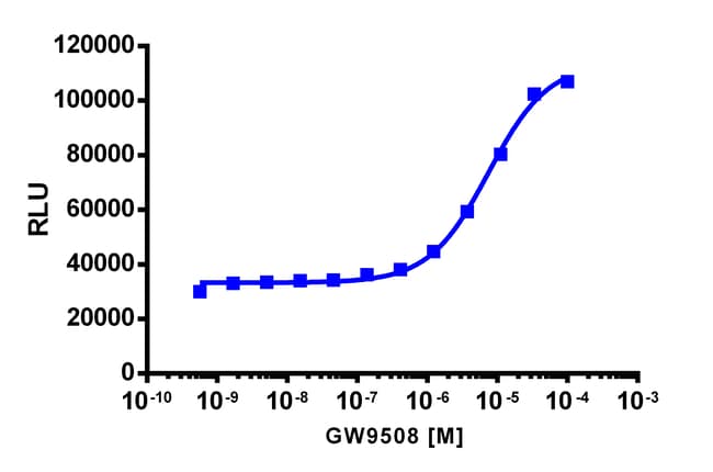 The PathHunter GPR120S eXpress kit provides an easy-to-use cell based assay to study drug candidates (small molecules or biologics) targeting GPCRs. This kit assesses ligand (e.g. free fatty acids) based activation of GPR120S GPCR activity via detection of β-arrestin recruitment. The included cell line overexpresses ProLink-tagged GPR120S and EA-tagged β-Arrestin-2. Activation of GPR120S stimulates the recruitment of β-Arrestin-2 and produces EFC signal. eXpress kits are a convenient, ready-to-use format which contains all materials needed to run the assay, including single-use vials of cryopreserved cells, cell plating media, detection reagent, and assay plates. For detailed product information, User Manual and Datasheet, visit www.discoverx.com/express.
