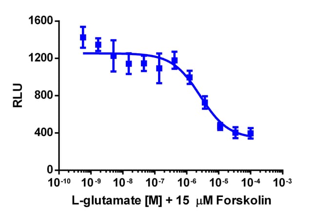 The cAMP Hunter GRM6 eXpress kit provides an easy-to-use cell based assay to study drug candidates (small molecules or biologics) targeting GPCRs. This kit assesses ligand (e.g. L-glutamate) based activation of GRM6 GPCR activity via detection of decreasing levels of intracellular cAMP. This product uses EFC technology. The cells overexpress wild type GRM6, a naturally Gi/Go coupled GPCR. Upon activation of GRM6, the decrease in levels of intracellular cAMP leads to a decreased signal from EFC when the cAMP detection kit is applied. eXpress kits are a convenient, ready-to-use format which contains all materials needed to run the assay, including single-use vials of cryopreserved cells, cell plating media, detection reagent, and assay plates. For detailed product information, User Manual and Datasheet, visit www.discoverx.com/express.