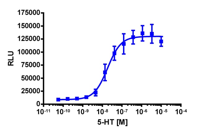 The PathHunter HTR2C(VGV) eXpress kit provides an easy-to-use cell based assay to study drug candidates (small molecules or biologics) targeting GPCRs. This kit assesses ligand (e.g. serotonin) based activation of HTR2C(VGV) GPCR activity via detection of β-arrestin recruitment. The included cell line overexpresses ProLink-tagged HTR2C(VGV) and EA-tagged β-Arrestin-2. Activation of HTR2C(VGV) stimulates the recruitment of β-Arrestin-2 and produces EFC signal. eXpress kits are a convenient, ready-to-use format which contains all materials needed to run the assay, including single-use vials of cryopreserved cells, cell plating media, detection reagent, and assay plates. For detailed product information, User Manual and Datasheet, visit www.discoverx.com/express.