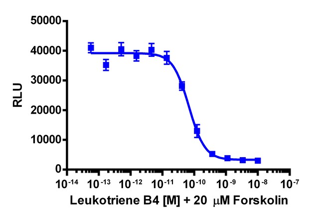 The cAMP Hunter LTB4R eXpress kit provides an easy-to-use cell based assay to study drug candidates (small molecules or biologics) targeting GPCRs. This kit assesses ligand (e.g. leukotriene B4) based activation of LTB4R GPCR activity via detection of decreasing levels of intracellular cAMP. This product uses EFC technology. The cells overexpress wild type LTB4R, a naturally Gi/Go coupled GPCR. Upon activation of LTB4R, the decrease in levels of intracellular cAMP leads to a decreased signal from EFC when the cAMP detection kit is applied. eXpress kits are a convenient, ready-to-use format which contains all materials needed to run the assay, including single-use vials of cryopreserved cells, cell plating media, detection reagent, and assay plates. For detailed product information, User Manual and Datasheet, visit www.discoverx.com/express.