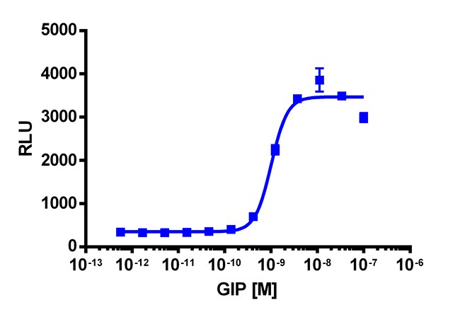 The cAMP Hunter mGIPR eXpress kit provides an easy-to-use cell based assay to study drug candidates (small molecules or biologics) targeting GPCRs. This kit assesses ligand (e.g. GIP) based activation of mGIPR GPCR activity via detection of increasing levels of intracellular cAMP. This product uses EFC technology. The cells overexpress wild type mGIPR, a naturally Gs coupled GPCR. Upon activation of mGIPR, the increase in levels of intracellular cAMP leads to an increased signal from EFC when the cAMP detection kit is applied. eXpress kits are a convenient, ready-to-use format which contains all materials needed to run the assay, including single-use vials of cryopreserved cells, cell plating media, detection reagent, and assay plates. Please note that this product expresses the Mouse version of this protein. For detailed product information, User Manual and Datasheet, visit www.discoverx.com/express.