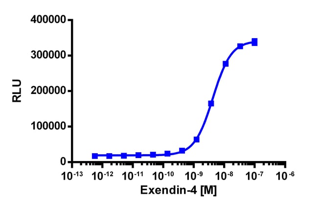The PathHunter mGLP1R eXpress kit provides an easy-to-use cell based assay to study drug candidates (small molecules or biologics) targeting GPCRs. This kit assesses ligand (e.g. exendin-4) based activation of mGLP1R GPCR activity via detection of β-arrestin recruitment. The included cell line overexpresses ProLink-tagged mGLP1R and EA-tagged β-Arrestin-2. Activation of mGLP1R stimulates the recruitment of β-Arrestin-2 and produces EFC signal. eXpress kits are a convenient, ready-to-use format which contains all materials needed to run the assay, including single-use vials of cryopreserved cells, cell plating media, detection reagent, and assay plates. Please note that this product expresses the Mouse version of this protein. For detailed product information, User Manual and Datasheet, visit www.discoverx.com/express.