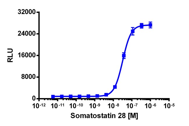 The PathHunter mSSTR2 eXpress kit provides an easy-to-use cell based assay to study drug candidates (small molecules or biologics) targeting GPCRs. This kit assesses ligand (e.g. somatostatin 28) based activation of mSSTR2 GPCR activity via detection of β-arrestin recruitment. The included cell line overexpresses ProLink-tagged mSSTR2 and EA-tagged β-Arrestin-2. Activation of mSSTR2 stimulates the recruitment of β-Arrestin-2 and produces EFC signal. eXpress kits are a convenient, ready-to-use format which contains all materials needed to run the assay, including single-use vials of cryopreserved cells, cell plating media, detection reagent, and assay plates. Please note that this product expresses the Mouse version of this protein. For detailed product information, User Manual and Datasheet, visit www.discoverx.com/express.