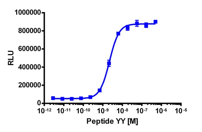 The PathHunter NPY2R eXpress kit provides an easy-to-use cell based assay to study drug candidates (small molecules or biologics) targeting GPCRs. This kit assesses ligand (e.g. peptide YY) based activation of NPY2R GPCR activity via detection of β-arrestin recruitment. The included cell line overexpresses ProLink-tagged NPY2R and EA-tagged β-Arrestin-2. Activation of NPY2R stimulates the recruitment of β-Arrestin-2 and produces EFC signal. eXpress kits are a convenient, ready-to-use format which contains all materials needed to run the assay, including single-use vials of cryopreserved cells, cell plating media, detection reagent, and assay plates. For detailed product information, User Manual and Datasheet, visit www.discoverx.com/express.