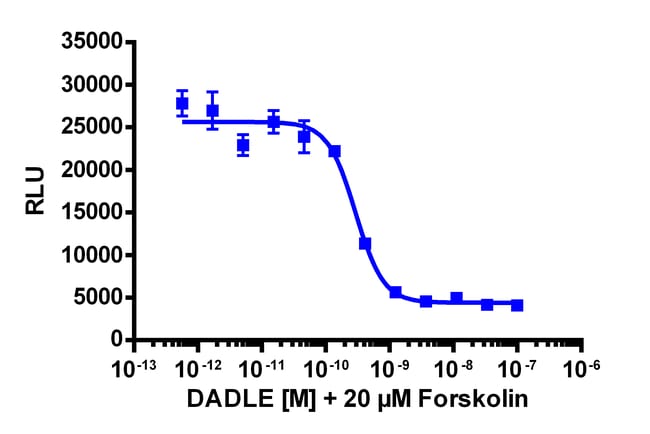 The cAMP Hunter OPRD1 eXpress kit provides an easy-to-use cell based assay to study drug candidates (small molecules or biologics) targeting GPCRs. This kit assesses ligand (e.g. DADLE, DPDPE) based activation of OPRD1 GPCR activity via detection of decreasing levels of intracellular cAMP. This product uses EFC technology. The cells overexpress wild type OPRD1, a naturally Gi/Go coupled GPCR. Upon activation of OPRD1, the decrease in levels of intracellular cAMP leads to a decreased signal from EFC when the cAMP detection kit is applied. eXpress kits are a convenient, ready-to-use format which contains all materials needed to run the assay, including single-use vials of cryopreserved cells, cell plating media, detection reagent, and assay plates. For detailed product information, User Manual and Datasheet, visit www.discoverx.com/express.
