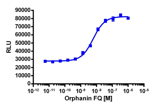 The PathHunter OPRL1 eXpress kit provides an easy-to-use cell based assay to study drug candidates (small molecules or biologics) targeting GPCRs. This kit assesses ligand (e.g. orphanin FQ) based activation of OPRL1 GPCR activity via detection of β-arrestin recruitment. The included cell line overexpresses ProLink-tagged OPRL1 and EA-tagged β-Arrestin-2. Activation of OPRL1 stimulates the recruitment of β-Arrestin-2 and produces EFC signal. eXpress kits are a convenient, ready-to-use format which contains all materials needed to run the assay, including single-use vials of cryopreserved cells, cell plating media, detection reagent, and assay plates. For detailed product information, User Manual and Datasheet, visit www.discoverx.com/express.