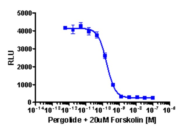 The cAMP Hunter rDRD2L eXpress kit provides an easy-to-use cell based assay to study drug candidates (small molecules or biologics) targeting GPCRs. This kit assesses ligand (e.g. dopamine, pergolide) based activation of rDRD2L GPCR activity via detection of decreasing levels of intracellular cAMP. This product uses EFC technology. The cells overexpress wild type rDRD2L, a naturally Gi/Go coupled GPCR. Upon activation of rDRD2L, the decrease in levels of intracellular cAMP leads to a decreased signal from EFC when the cAMP detection kit is applied. eXpress kits are a convenient, ready-to-use format which contains all materials needed to run the assay, including single-use vials of cryopreserved cells, cell plating media, detection reagent, and assay plates. Please note that this product expresses the Rat version of this protein. For detailed product information, User Manual and Datasheet, visit www.discoverx.com/express.