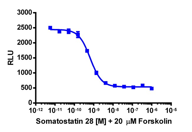 The cAMP Hunter SSTR3 eXpress kit provides an easy-to-use cell based assay to study drug candidates (small molecules or biologics) targeting GPCRs. This kit assesses ligand (e.g. somatostatin 28) based activation of SSTR3 GPCR activity via detection of decreasing levels of intracellular cAMP. This product uses EFC technology. The cells overexpress wild type SSTR3, a naturally Gi/Go coupled GPCR. Upon activation of SSTR3, the decrease in levels of intracellular cAMP leads to a decreased signal from EFC when the cAMP detection kit is applied. eXpress kits are a convenient, ready-to-use format which contains all materials needed to run the assay, including single-use vials of cryopreserved cells, cell plating media, detection reagent, and assay plates. For detailed product information, User Manual and Datasheet, visit www.discoverx.com/express.