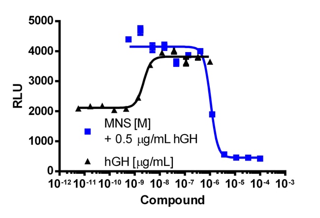 The PathHunter eXpress SYK Activity Assay is a stable, engineered cell line for use in studying small molecule drug candidates targeting the SYK kinase domain. The cell line is engineered to express the catalytic domain from SYK fused to the cytokine receptor binding domain (CRBD) of JAK2. The cells co-express an Enzyme Acceptor (EA) tagged SH2 domain and a ProLink (PK) tagged Cytokine receptor. The CRBD is designed to bind the CTK catalytic domain to the GHR-PK. Activation of the GHR-PK induces receptor phosphorylation by the SYK catalytic domain. This leads to SH2-EA recruitment and production of EFC signal. eXpress kits are a convenient, ready-to-use format which contains all materials needed to run the assay, including single-use vials of cryopreserved cells, cell plating media, detection reagent, and assay plates. For detailed product information, User Manual and Datasheet, visit www.discoverx.com/express.